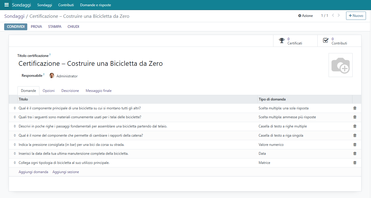 Al termine dei corsi o dei quiz, Odoo consente di rilasciare certificazioni digitali. Puoi creare esami finali composti da diverse tipologie di domande e stabilire criteri chiari di superamento. Ogni certificato è personalizzabile con logo, testo e dati del partecipante.