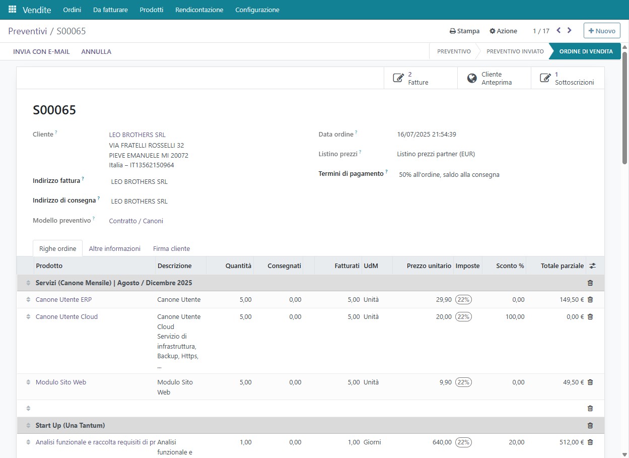 Ogni ordine cliente è collegato al preventivo, ai prodotti e al magazzino. Così sai sempre cosa è stato confermato, cosa deve essere consegnato e cosa è già fatturato. Puoi gestire anche ordini ricorrenti o contratti a lungo termine.